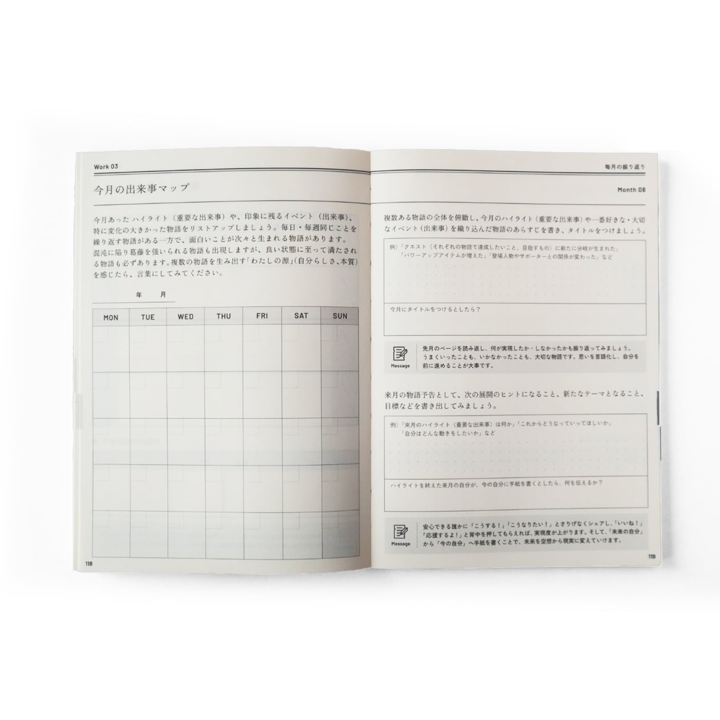 思う存分書いていただくために、パタンと180度開く「糸かがり綴じ」という製本方法を採用。背表紙をテープで留めたノートブックのような佇まいも特徴的です。